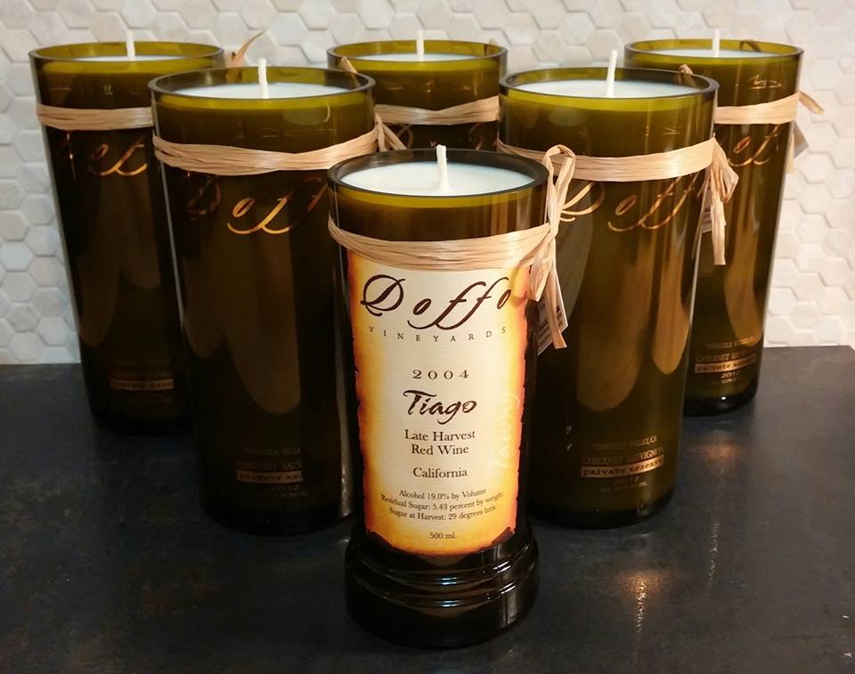 Once the wine is consumed, each bottle is collected, washed, cut, and sanded by hand, resulting in a fine, clean finish. After the soy wax is poured, the result is an everlasting aroma, leaving a story behind with each bottle.